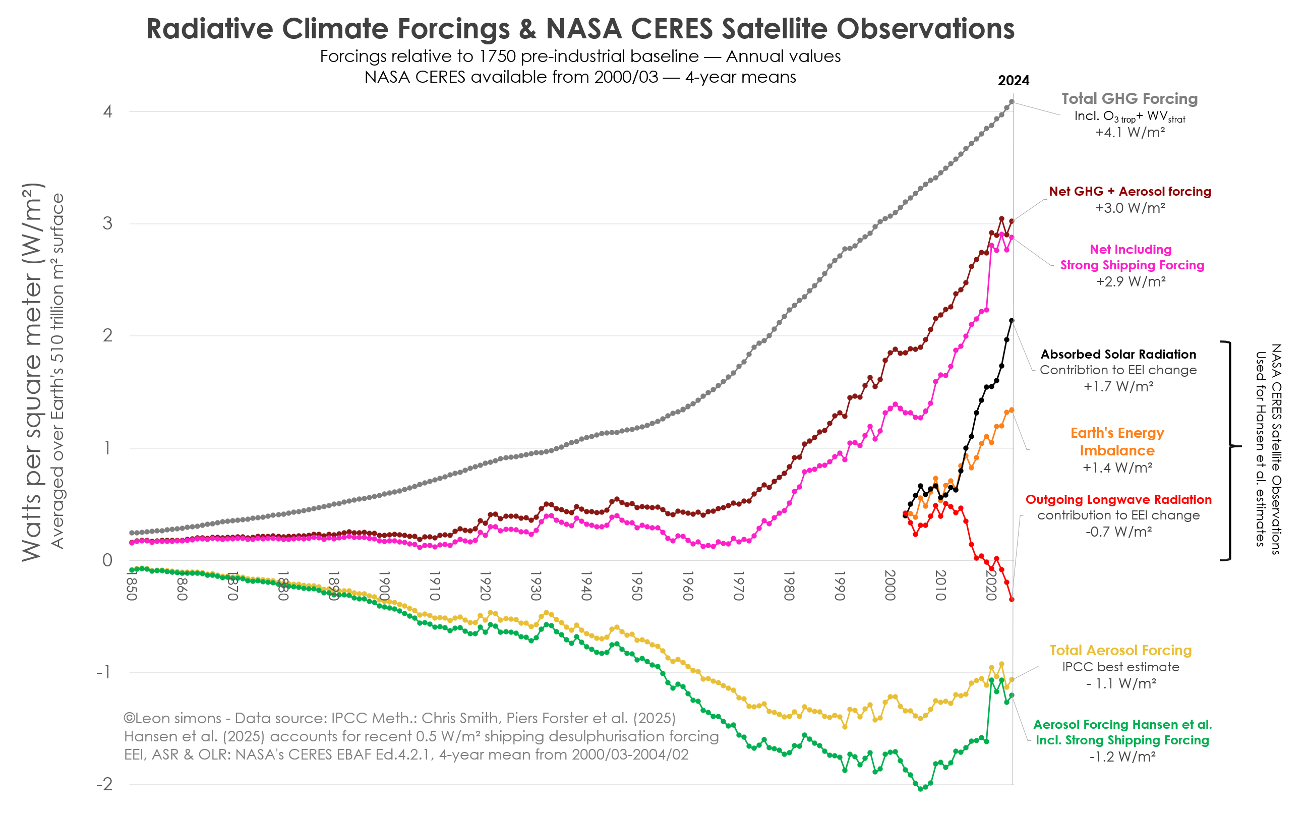 Using NASA CERES satellites observations, the present and near term climate forcing increase is even higher than based on the highest emission scenario (SSP5-8.5)