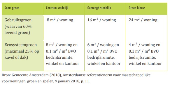 Toen Amsterdam besloot om fors te gaan verdichten (Koers 2025) is óók besloten om een "Referentienorm voor Maatschappelijke Voorzieningen en Groen" te maken. In deze Referentienorm is een Groennorm vastgelegd. De norm is niet overal gelijk: in het centrum is hij lager dan in een buitenwijk. Gemiddeld moet er 22 vierkante meter openbaar groen per woning worden gemaakt. Dit wordt in de meeste nieuwbouwwijken niet gehaald. Doordat in de meeste nieuwbouwprojecten onvoldoende openbaar groen wordt ingepland, daalt het aantal vierkante meters openbaar groen per inwoner al geruime tijd.